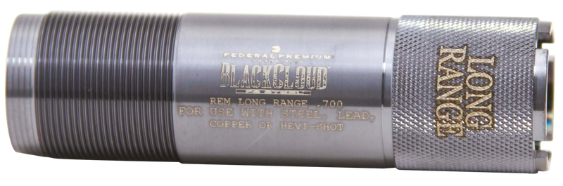This Carlson's Black Cloud choke tube is designed for 12-gauge shotguns with Rem Choke configuration and features a titanium-coated steel construction for durability. The long-range constriction (.700 diameter) is optimized for steel shot performance at extended distances. Installation is straightforward via the standard Rem Choke interface.
