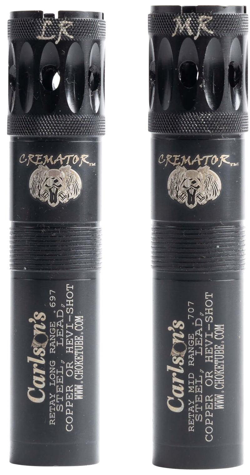 Carlson's Cremator choke tubes are ported 12-gauge choke tubes featuring Triple Shot Technology (TST) with three graduated rings in the taper section for reduced pellet deformation and denser patterns. Constructed from 17-4 stainless steel, these mid-range to long-range constriction tubes are designed for waterfowl and upland hunting. The package includes two choke tubes for quick installation in compatible shotguns.