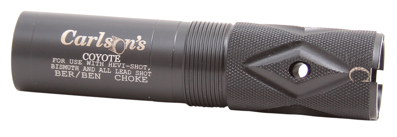 Extended ported choke tube designed for 12 gauge Beretta/Benelli Mobil shotguns, constructed from 17-4 stainless steel with black finish. Specifically engineered for coyote and predator hunting, delivering dense patterns with T shot and buckshot loads at distances up to 70 yards. Compatible with Hevi-Shot, Bismuth, and lead ammunition; not for use with steel shot.