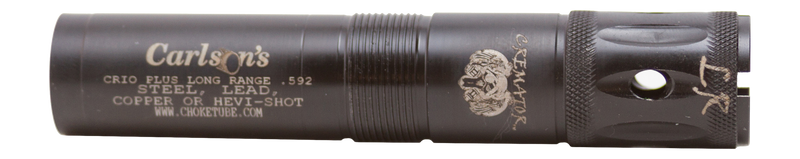 Carlson's Cremator Ported choke tube for 20 gauge Benelli Crio/Crio Plus shotguns with .592" diameter constriction, designed for long-range waterfowl hunting. Features Triple Shot Technology (TST) with three graduated rings in the taper section that reduce pellet deformation, minimize flyers, and produce denser shot patterns. Tube installs directly into the shotgun's choke tube port.