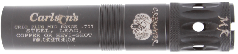 Carlson's Cremator Crio Plus choke tube is a mid-range ported tube designed for Benelli Crio and Crio Plus shotguns in 12 gauge. Constructed from 17-4 stainless steel with a .707 constriction diameter, it features Triple Shot Technology (TST) with graduated rings for reduced pellet deformation and denser patterns. The tube installs directly into compatible Benelli shotguns and is effective for waterfowl and general shotgun use.