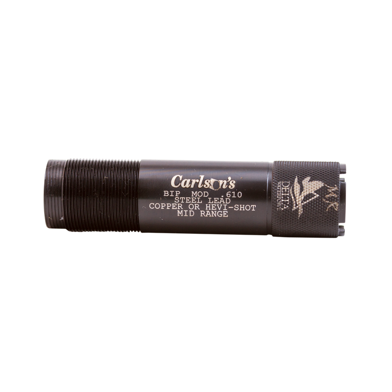 Carlson's Delta Waterfowl Extended Choke Tube is designed for 20 gauge Browning Invector-Plus shotguns with a .610" constriction diameter for mid-range waterfowl hunting. Constructed from 17-4 stainless steel with a black finish and knurled extension that projects 3/4" beyond the barrel to prevent steel shot damage. Features a longer parallel section for denser patterns and reduced flyers when using steel shot.