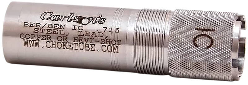 Carlson's Sporting Clays choke tube for 12 gauge shotguns compatible with Beretta and Benelli platforms. Made from 17-4 stainless steel with precision machining and a 25% larger parallel section for more consistent shot patterns. Features knurled end for easy removal and laser-marked constriction designation; suitable for lead, copperplated nickel, Hevi-Shot, bismuth, tungsten, and steel shot.