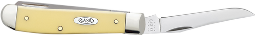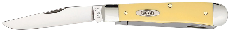 The Case Trapper is a classic two-blade folding knife featuring a 3.25" clip point and 3.27" spey blade made from chrome vanadium steel with a plain edge. It has a yellow synthetic handle, measures 7" overall length, and weighs 4 oz, making it suitable for everyday carry and general outdoor use.