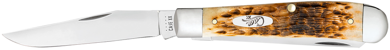 The Case Trapper is a medium-sized folding knife featuring dual blades: a 3.25" clip point and 3.27" spey blade, both crafted from Tru-Sharp stainless steel with a plain edge. The knife has an overall length of 7.4" when open and weighs 2.5 oz, with a peach seed jigged amber bone handle that provides traditional styling and grip.