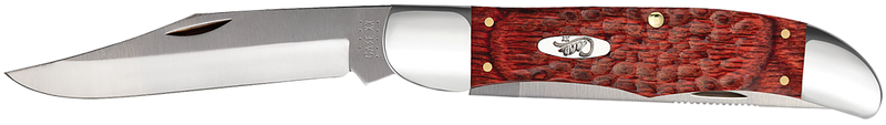The Case 00189 Hunter is a two-blade folding knife featuring a 4.10" clip point and skinner blade made of Tru-Sharp stainless steel with a plain edge. The knife has a jigged rosewood handle, measures 9.35" overall length, and comes with a leather sheath for convenient carry and storage.