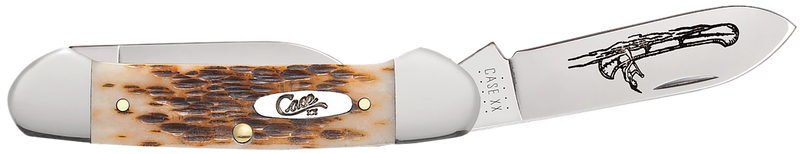 The Case Canoe is a two-blade folding knife featuring a 2.60" spear blade and 1.97" pen blade, both crafted from chrome vanadium steel with a plain edge and nail nick opening mechanism. The knife measures 4.5" closed and weighs 2.80 oz, with a peach seed jigged amber bone handle that provides a classic, durable grip.