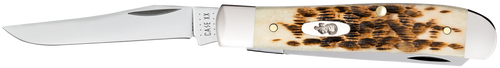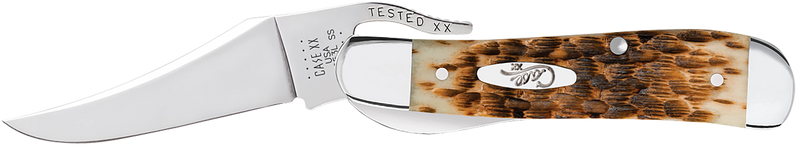 The Case RussLock is a 2.70" clip point folding knife featuring a mirror polished Tru-Sharp stainless steel blade with a gimped lever opening mechanism. The knife showcases a peach seed jigged amber bone handle and weighs 2.70 oz, making it a lightweight option for everyday carry or outdoor use.