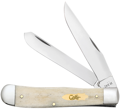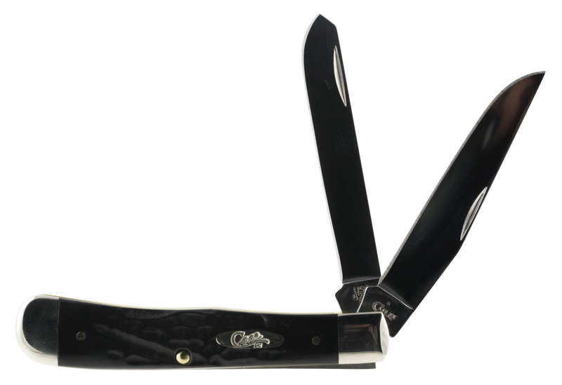The Case Trapper is a two-blade folding knife featuring a 3.25" clip point and spey blade made from Tru-Sharp stainless steel with a plain edge. The knife has a rough black jigged synthetic handle and measures 4.5" closed, weighing 4 oz, making it suitable for general cutting tasks and outdoor use.