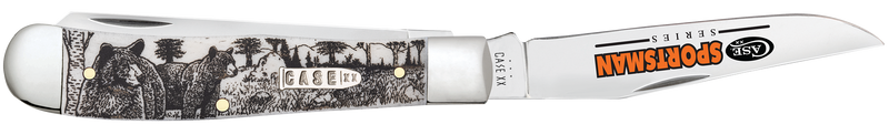 The Case Sportsman Trapper features dual blades including a 3.24" clip point and 3.27" spey blade made from Tru-Sharp stainless steel with a plain edge. The knife has a natural bone handle with bear wildlife engraving and opens via nail nick mechanism, making it suitable for outdoor and hunting applications. Overall length is 4.13" when closed, weighing 4 oz.
