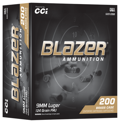 CCI Blazer Brass 9mm 124gr FMJ Handgun Ammo, 200 Round Box - 52012BB