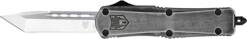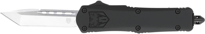 This CobraTec auto double-action out-the-front knife features a 3" D2 steel tanto blade with a glass breaker and an overall length of 8". The handle is constructed from zinc aluminum alloy for durability. It includes a nylon sheath for secure carry and storage.