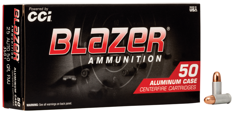 CCI Blazer 25 ACP handgun ammunition features 50 grain full metal jacket bullets at 755 fps muzzle velocity. Aluminum casing provides reliable performance for target shooting and personal protection applications. Each box contains 50 rounds.
