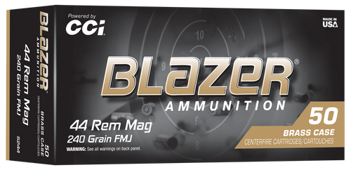 CCI Blazer 44 Rem Mag handgun ammunition features 240-grain jacketed hollow point bullets at 1200 fps muzzle velocity, delivering 767 ft-lbs of energy. The aluminum cases are heat-treated aircraft-grade material, offering reliable and accurate performance for training and target shooting at an affordable price point. Packaged 50 rounds per box, 20 boxes per case.