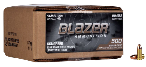 CCI Blazer 9mm Luger ammunition features 115 grain full metal jacket bullets loaded to 1145 fps with 335 ft-lbs of muzzle energy. The rounds use heat-treated aluminum cases with Boxer primers and are designed for affordable range training and target shooting.