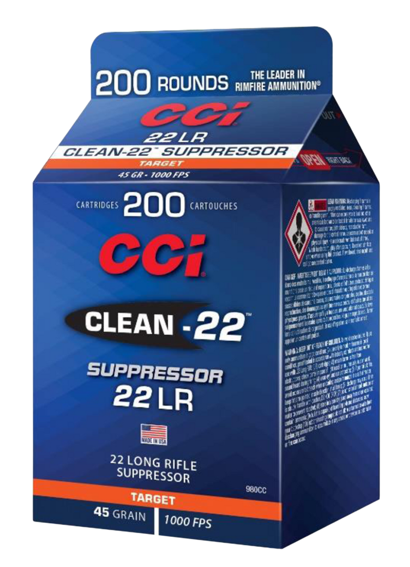 CCI Clean-22 Suppressor ammunition is a .22 LR rimfire round featuring 45-grain lead round nose bullets loaded to 1000 fps in reloadable brass cases. The advanced polymer bullet coating reduces lead fouling in suppressors by up to 60 percent, making it ideal for shooters using suppressed .22 LR firearms who want easier cleaning and maintenance.