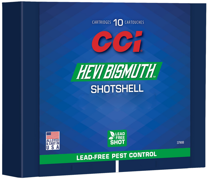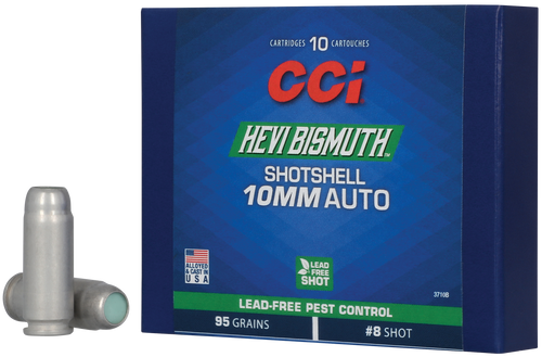 CCI Hevi-Bismuth centerfire handgun shotshell in 45 ACP with 115gr bismuth shot at 1150 fps. Built on CCI's proven centerfire handgun shotshell design with Catalyst lead-free primer and bismuth pellets that deliver nearly the same density and downrange energy as lead while meeting all non-toxic ammunition requirements. Packaged 10 rounds per box, 20 boxes per case.