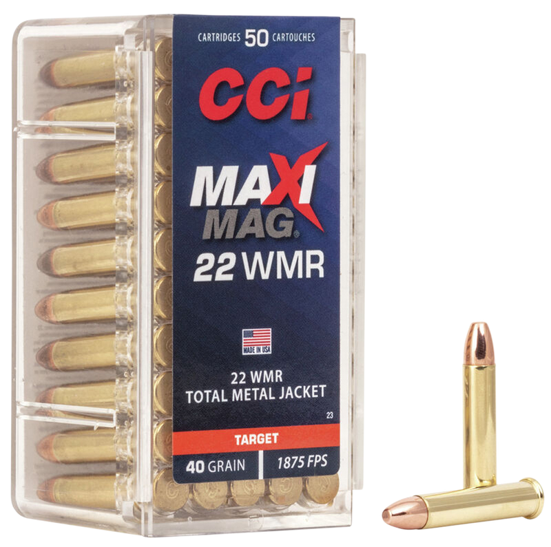 CCI Maxi-Mag .22 WMR rimfire ammunition features a 40-grain total metal jacket bullet designed for reliable feeding and consistent accuracy. With a muzzle velocity of 1875 fps and brass casing, this ammunition is suitable for target shooting, plinking, and hunting applications.