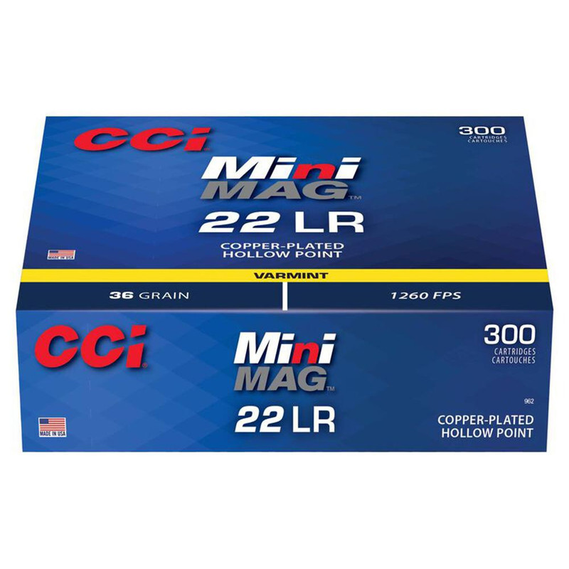 CCI Mini-Mag .22 LR ammunition featuring 36-grain copper-plated hollow point bullets at 1260 fps, designed for varmint hunting and small game. The brass casing and clean-burning propellants provide reliable cycling and performance, with sure-fire CCI priming.