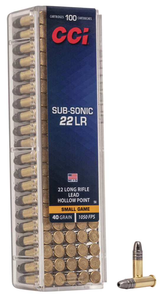 CCI Subsonic .22 LR ammunition loaded with 40 grain lead hollow point bullets for small game hunting and target shooting. Features subsonic velocity of 1050 fps with clean-burning propellants and reliable bullet expansion without fragmentation, delivering quieter performance than standard .22 LR loads.