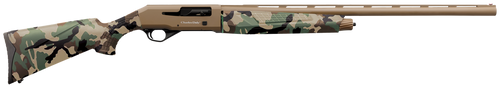 Semi-auto gas-operated shotgun chambered in 12 Gauge 3" with a 28" barrel and 4+1 round magazine tube capacity. Features checkered synthetic Woodland Camo furniture, aluminum receiver with Cerakote FDE finish, and Beretta/Benelli Mobile Choke threads (IC, M, F). Weighs 6.9 lbs with manual safety and auto ejection.