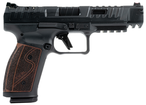 The Canik SFX Rival is a striker-fired semi-auto 9mm pistol with a 5" barrel, designed for competitive shooting in IDPA, IPSC, and USPSA competition without restrictions. It features a total length of 8.1", height of 5.7", width of 1.41", and weighs 29.5 oz. This firearm combines performance and affordability for the competitive shooter.