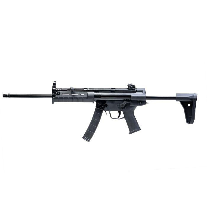 Semi-automatic rifle chambered in 9mm Luger with a 16.5" cold hammer-forged threaded barrel and roller-delayed blowback action. Features a Magpul SL collapsible stock, M-LOK handguard, adjustable rear sights, Picatinny optics mount, and includes one 32-round magazine. Weighs 6.5 lbs with an overall length of 28.5" to 33.5" depending on stock position.