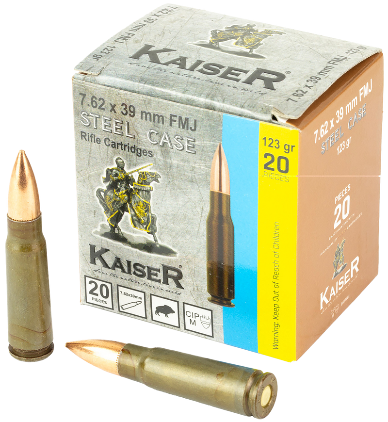Century Arms Kaiser ammunition in 7.62x39 caliber with 123 grain full metal jacket bullets. Features steel cases with Berdan primers and comes in 20-round boxes, 50 boxes per case.