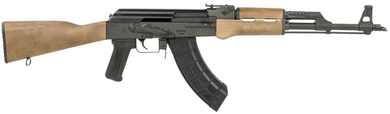 Century Arms BFT47 is a semi-automatic AK-pattern rifle chambered in 7.62x39mm with a 16.5" chrome moly steel barrel fitted with a slant compensator/brake. Features a black phosphate finished receiver, kona brown wood furniture with polymer grip, adjustable sights, bulged forged trunnion, and includes one 30-round magazine and cleaning rod.