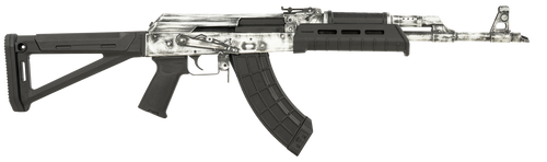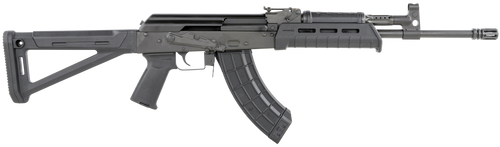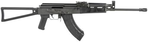 Semi-automatic AK-platform rifle chambered in 7.62x39mm with a 16.5" chromoly steel barrel and 10+1 capacity. Features a black synthetic stock with integrated shark fin grip, adjustable sights, and California-compliant design. Weighs 8 lbs with an overall length of 35.25".