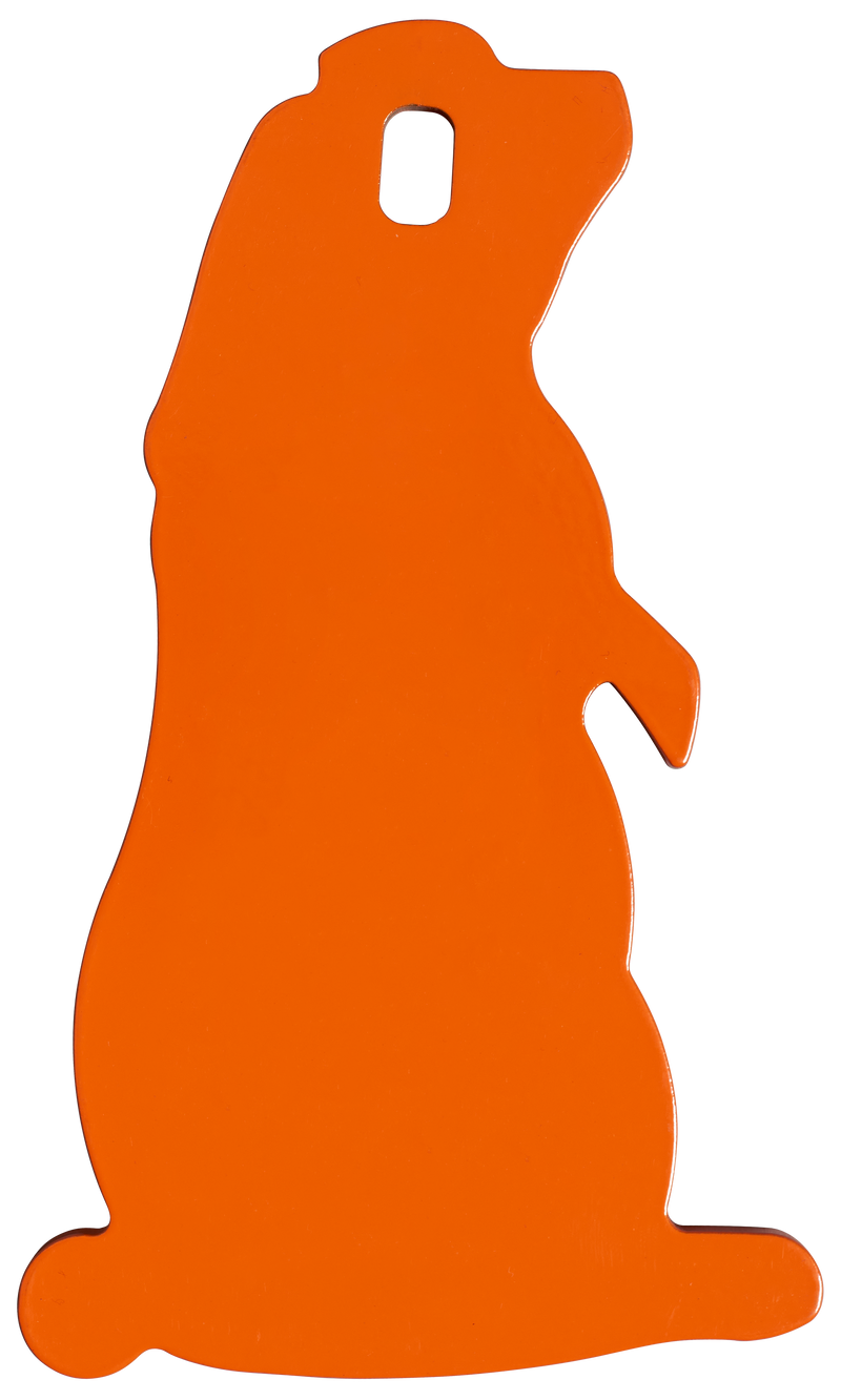 This rimfire steel target features a prairie dog animal shape made from AR500-comparable 1/4" steel construction designed for .22LR rifles. The high-visibility orange powder coating allows easy target acquisition at distance, and the reusable steel construction withstands repeated impacts for extended range use.