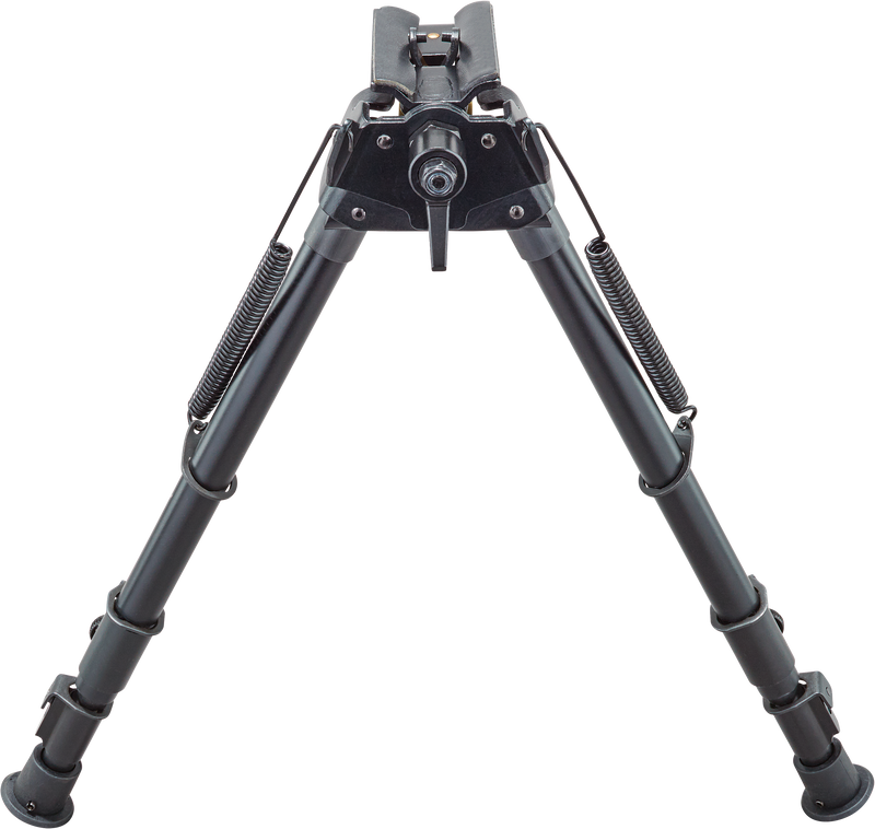 This pivot bipod features telescoping legs with spring return and adjusts from 14.5" to 29.25" in height, making it suitable for prone, sitting, and kneeling shooting positions. The pivoting design accommodates uneven terrain, and it attaches via swivel stud to most rifle platforms. Constructed from lightweight anodized aluminum with non-slip feet and lockable positions.