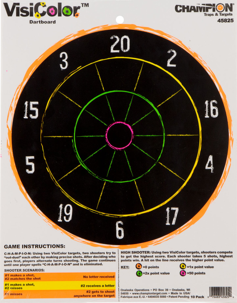 Champion VisiColor dartboards feature high-visibility multi-colored impact halos for easy identification of shot locations, based on Champion's proven VisiShot technology. Each 10-pack includes targets with a 5" double-bullseye and sight-in options for shooters to practice and sight in firearms. These hanging paper targets measure 11" x 14" and are suitable for all firearm types.
