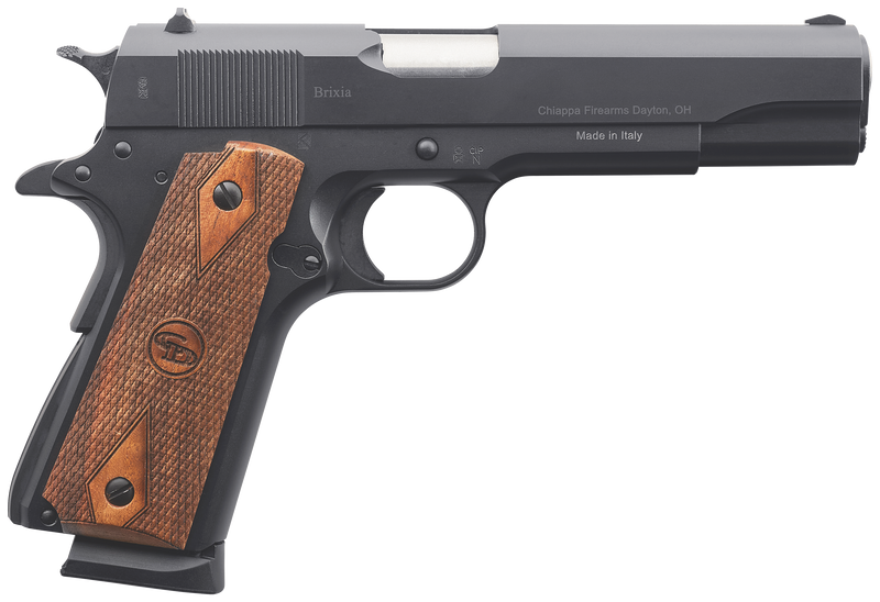 Semi-auto 1911-style pistol chambered in 45 ACP with a 5" barrel and 8+1 capacity. Features a black steel slide and frame with diamond checkered walnut grips, fixed blade front and dovetail rear sights, and manual thumb safety. Weighs 2.45 lbs with an overall length of 8.63".