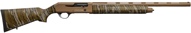 Semi-automatic shotgun chambered in 20 Gauge with 3" chamber, 22" ventilated rib barrel, and 4+1 capacity. Features a Flat Dark Earth Cerakote finish with Mossy Oak Bottomland synthetic stock and forend, fixed fiber optic front sight, and includes three interchangeable chokes (Improved Cylinder, Modified, Full). Weighs 7 lbs with an overall length of 42.38".