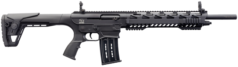 Charles Daly AR 12A is a 12 gauge semi-automatic shotgun with an 18.5" barrel, 5+1 capacity, and 3" chamber. Features a black aluminum receiver, black synthetic adjustable comb stock, flip-up front and rear sights, and weighs 8.2 lbs with a 37.9" overall length.