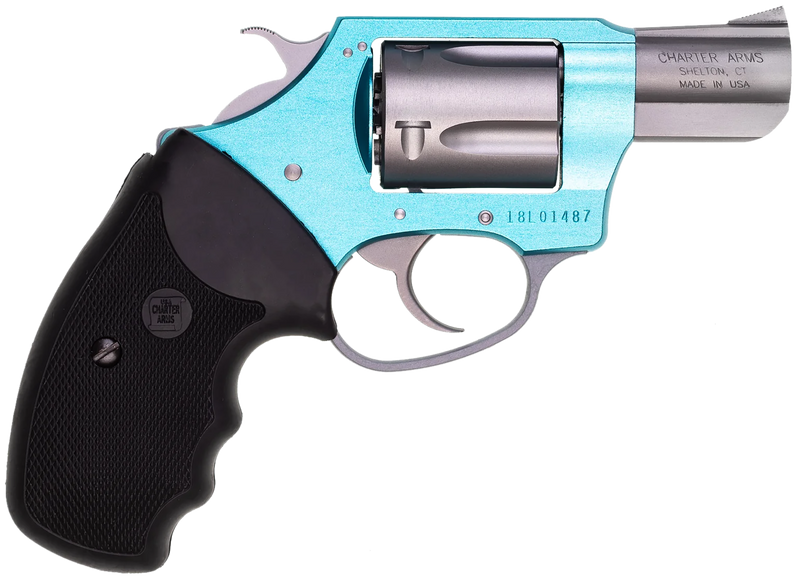 Charter Arms Undercover Lite in .38 Special with a 2" stainless steel barrel and 5-round capacity, featuring double/single action and fixed sights. The turquoise anodized aluminum frame paired with stainless steel barrel and cylinder keeps the weight to just 12 oz, making it an excellent choice for everyday carry or personal protection. Includes black rubber grips with finger grooves and an exposed hammer.