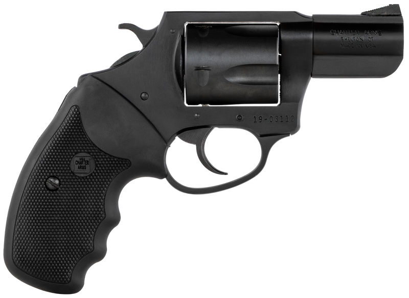 Charter Arms Mag Pug is a double/single action revolver chambered in .357 Magnum with a 2.2-inch black nitride barrel and 5-round capacity. This compact home defense revolver features fixed sights, a black finger-grooved rubber grip, and weighs 23 oz for balanced maneuverability and control.