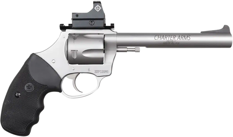 The Charter Arms Mastiff Target is a large-frame revolver chambered in .44 Special with a 6" stainless steel barrel and 5-round capacity. This revolver features a Picatinny rail for optic mounting, exposed hammer, and black rubber grips, making it well-suited for target shooting and precision applications.
