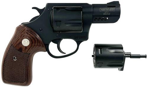 Charter Arms Double Dog is a double/single action revolver chambered in 357 Magnum with an included 9mm cylinder, featuring a 2.2" ported stainless steel barrel and 5-round capacity. The compact frame measures 6.75" overall with fixed sights, walnut grips, and an exposed hammer, weighing approximately 23 ounces. This combo configuration allows shooters to use either 357 Magnum/38 Special or 9mm ammunition with the same firearm.