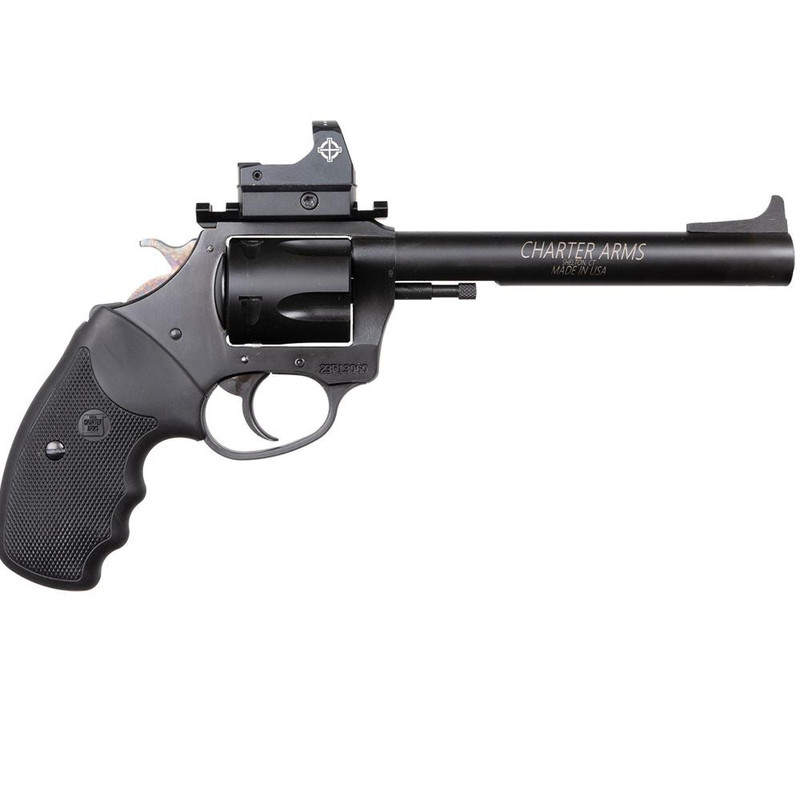 The Charter Arms Target Mastiff is a .357 Magnum revolver with a 6" barrel and 5-round capacity. It features a Picatinny rail for optic mounting and comes equipped with a Sightmark Micro Optic in an all-black nitride finish.
