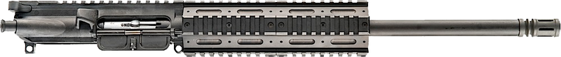 This is a complete upper receiver assembly chambered in 22 LR with a 16" heavy contour steel barrel and matte black polymer A3 receiver. It features a 7.80" quad Picatinny rail handguard and is compatible with mil-spec AR-15 lower receivers. The optic-ready upper comes with two 28-round magazines and is designed for hunting and target shooting applications.
