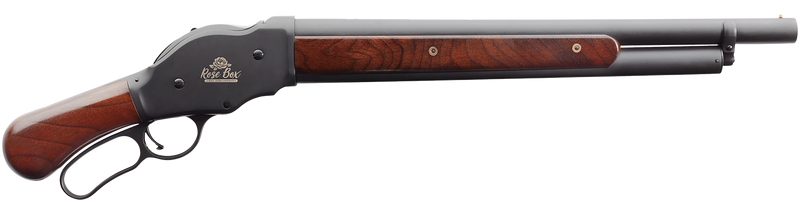 The Chiappa 1887 Rose Box Bootleg is a 12 Gauge lever-action shotgun with a 2.75" chamber and 18.5" barrel, holding 5+1 rounds. It features an engraved receiver, oiled walnut furniture with pistol grip, and a bead sight. This shotgun weighs 7.8 lbs with an overall length of 27.5" and comes with a modified choke.