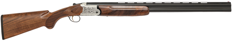 20 Gauge over/under break-action shotgun with 26" black chrome-lined vent rib barrels and 3" chambers. Features a nickel-plated engraved aluminum receiver, checkered walnut stock, fiber optic front sight, and includes five Mobil chokes (SK, IC, M, IM, F). Weighs 6.2 lbs with an overall length of 44".