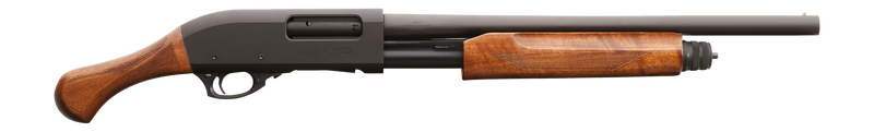 The Chiappa Honcho Tactical is a 20 gauge pump-action shotgun with an 18.5" barrel and 5+1 capacity, featuring a matte black steel receiver and walnut bird's head grip. This CA-compliant model weighs 5 lbs and measures 27" overall with fixed blade front sights and ambidextrous sling attachment points. Made in the USA, it combines compact tactical handling with traditional wood furniture.