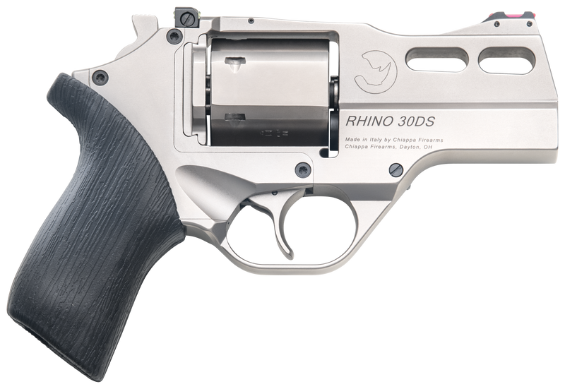 The Chiappa Rhino 30SAR is a 357 Magnum revolver with a 3" nickel-plated barrel and 6-round capacity, featuring single/double action with a concealed hammer and fiber optic front sight. The small-frame design includes a nickel-plated aluminum alloy frame, black rubber grips, and a ventilated rib barrel. California-compliant with moon clips included; weighs 27.2 oz with an overall length of 7.5".