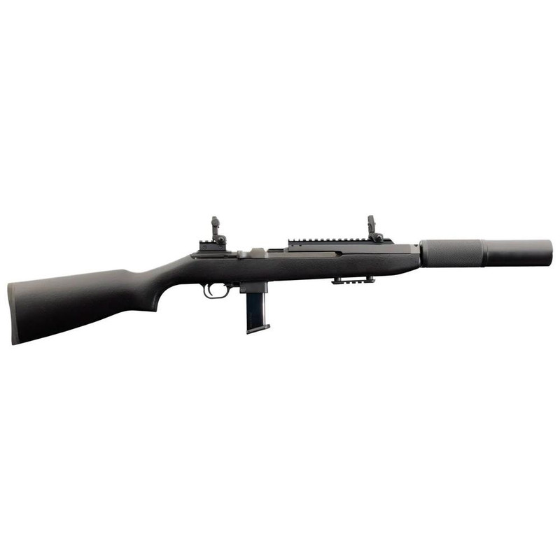 Semi-auto rifle chambered in 9mm Luger with a 19" barrel and 10-round capacity. Features a straight blowback design for reliability, adjustable flip-up sights, synthetic black textured stock, and accepts Beretta 92-style magazines. Weighs 6.6 lbs with an overall length of 39".
