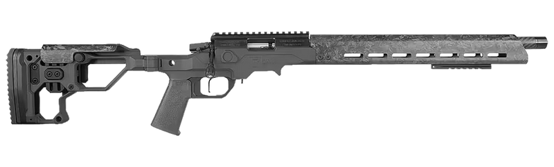 Bolt-action rimfire rifle chambered in 17 HMR with a 20" match-grade threaded barrel and 1-in-9" twist rate. Features a lightweight billet aluminum chassis with adjustable carbon fiber stock, TriggerTech trigger, Picatinny rail, and M-LOK accessory mounts. Weighs 6.2 lbs and includes a 50-yard sub-MOA accuracy guarantee.