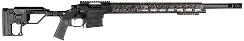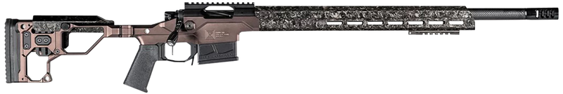 The Christensen Arms Modern Precision Rifle is a bolt-action chambered in 7mm PRC with a 26" threaded carbon fiber barrel and 1:8" twist rate. This ultra-lightweight rifle features a desert brown anodized folding billet aluminum chassis, carbon fiber handguard with M-LOK slots, integrated 20 MOA rail, and TriggerTech trigger. The complete package weighs 6.9 lbs and includes a black nitride side-baffle muzzle brake and AICS-compatible detachable magazine system.