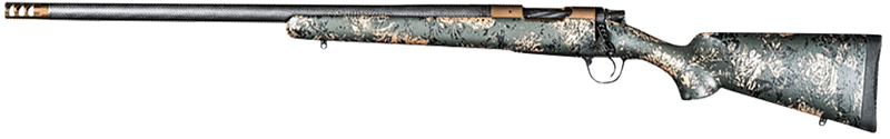 Left-hand bolt-action rifle chambered in 7mm-08 Rem with a 20" carbon fiber-wrapped stainless steel threaded barrel and removable side-baffle brake. Features a synthetic carbon fiber stock with green and black/tan accents, TriggerTech trigger, and weighs just 5.3 lbs. Backed by Christensen Arms' Sub-MOA Guarantee.